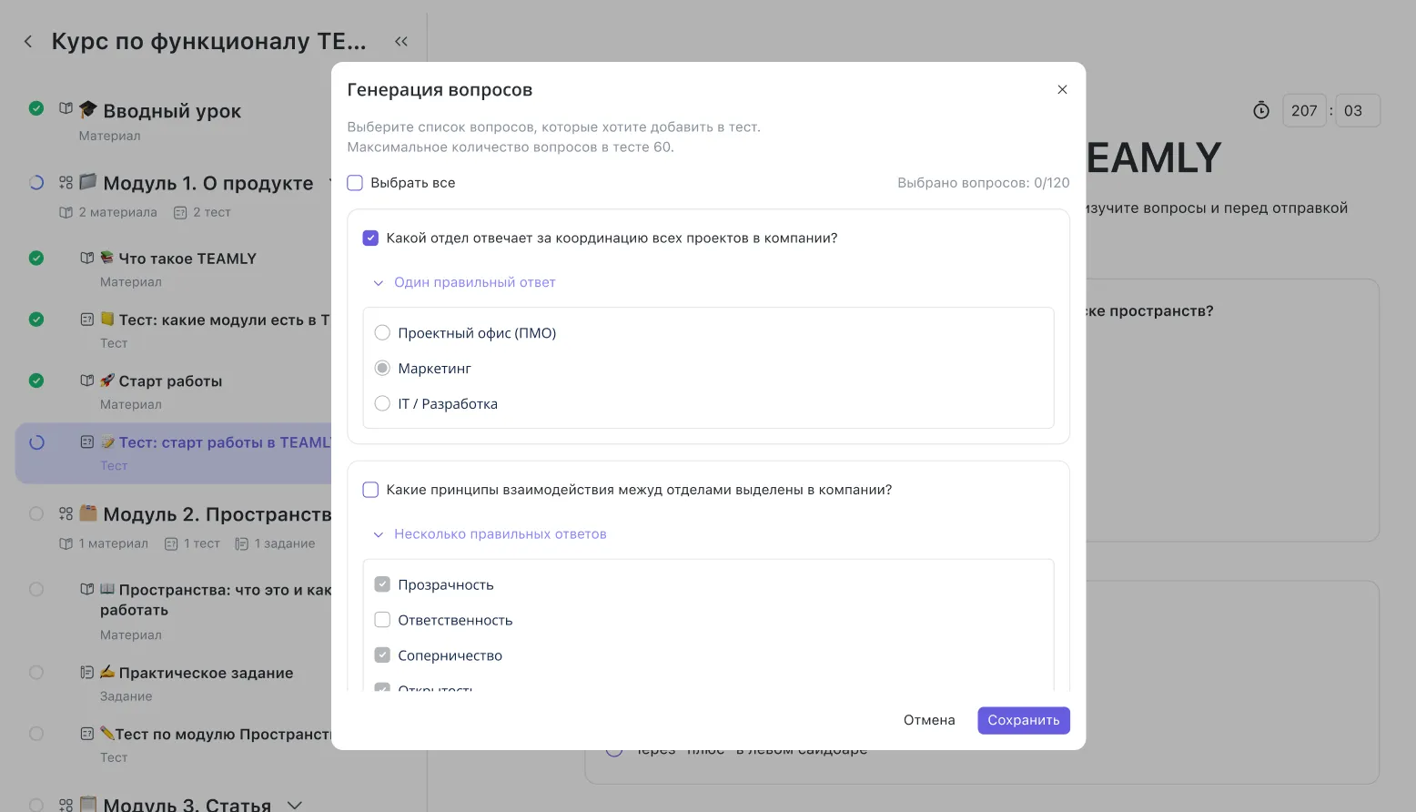 Выберите материалы и тип вопросов, а AI сформирует варианты вопросов разного типа.