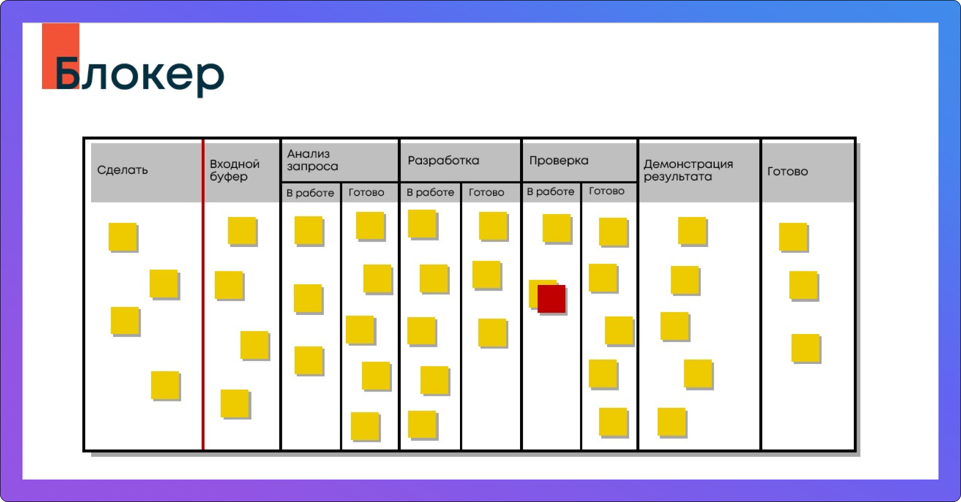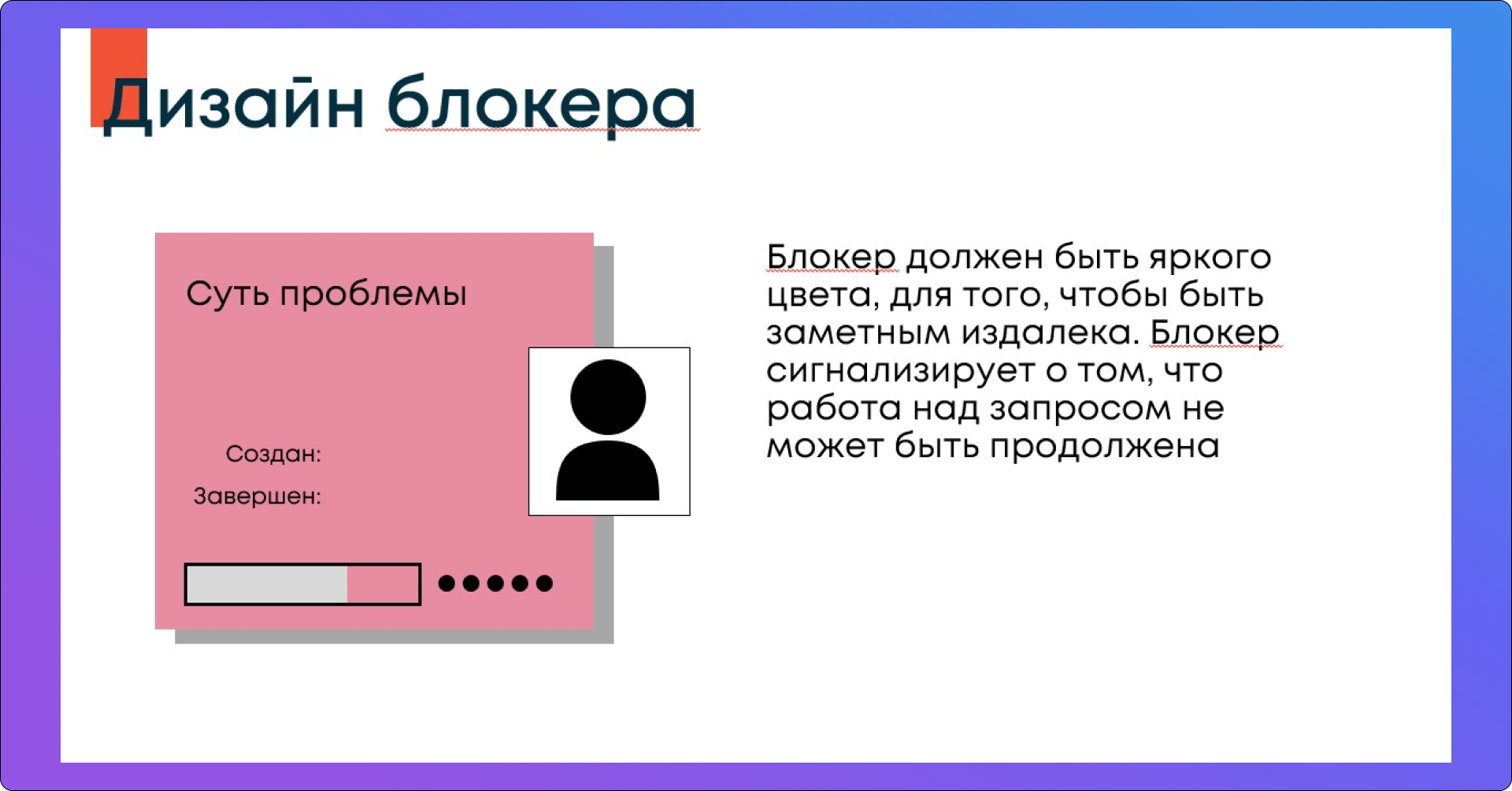 Лучше заводить блокер – заметную метку поверх текущей карточки. Она не передвигает работу по колонкам, а подсвечивает место, где мы споткнулись. Что указывать в блокере: