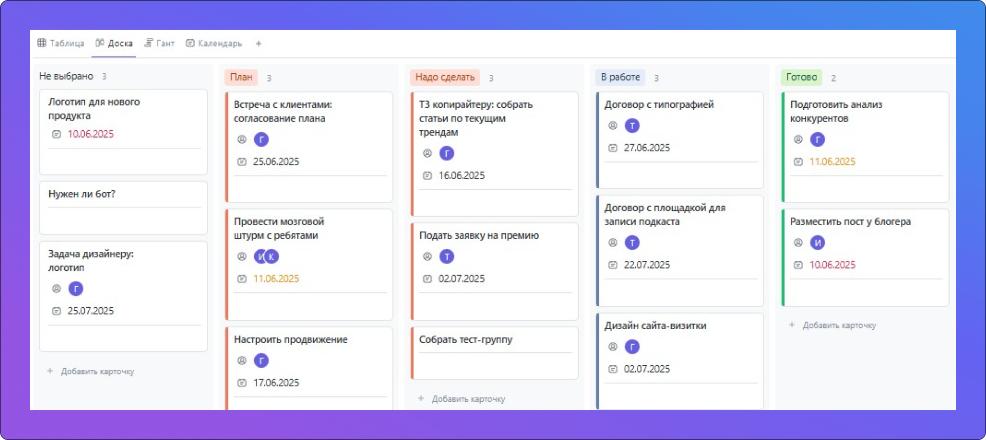Статусы и теги на карточках: задайте правило, что «красный» – это блокер, а «жёлтый» – риск.