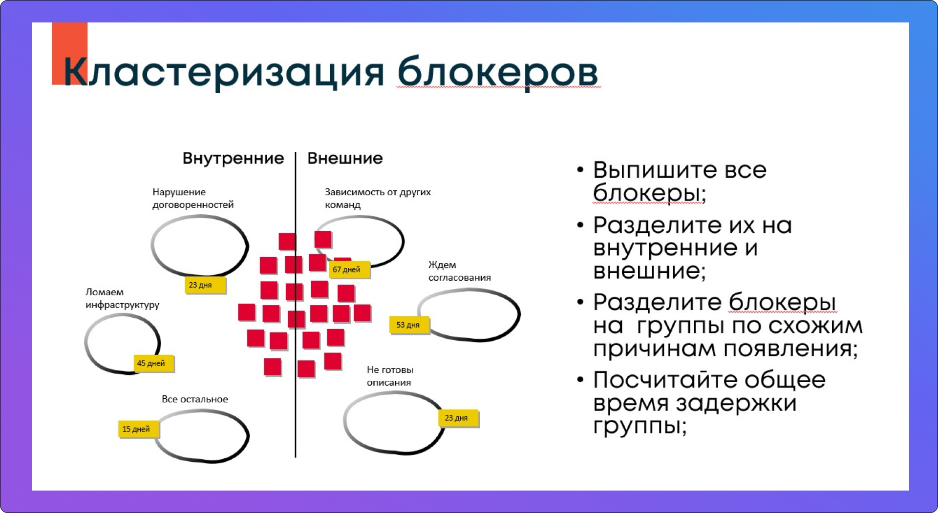 Классифицируйте: внутренние (процессы, договорённости, навыки) и внешние (инфраструктура, интеграции, зависимость от других отделов).
