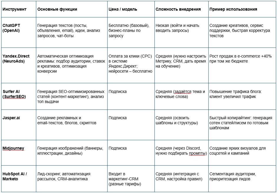 На рынке представлено множество ИИ-инструментов для маркетинга. Ниже – сравнение самых популярных решений: