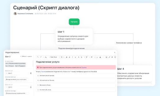 Для специалистов отделов продаж, поддержки, колл-центров, а также аккаунт-менеджеров разработали конструктор диалоговых сценариев (скриптов). Он позволяет создать схему диалога в формате наглядных блок-схем с различными ветвлениями.