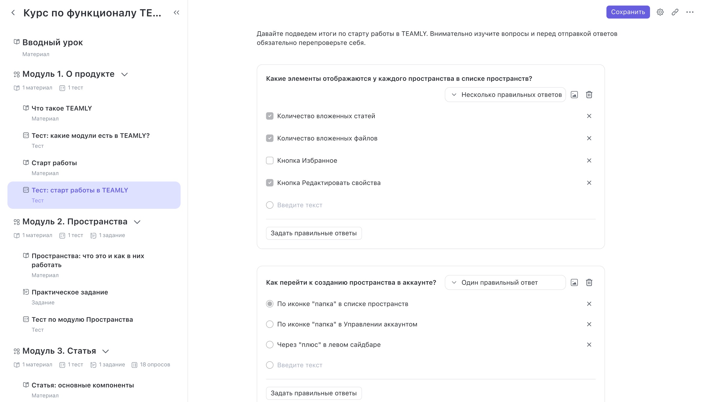 Кстати, курс может включать в себя сущности трёх типов: статья или лонгрид (добавляется как ссылка на элемент базы знаний), тест, опрос. Последний нужен для сбора обратной связи. Например, о том, насколько понятен был курс и насколько сложны тесты.