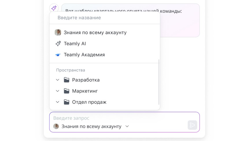 Ответить на вызовы рынка помогает TEAMLY. Еще больше возможностей открывается благодаря осеннему обновлению, в центре которого Teamly AI. Умный ассистент анализирует корпоративные материалы, формулирует точные ответы на вопросы сотрудников и помогает создавать учебные материалы на основе базы знаний. Это снижает нагрузку на экспертов, ускоряет работу команды и делает обучение более управляемым.