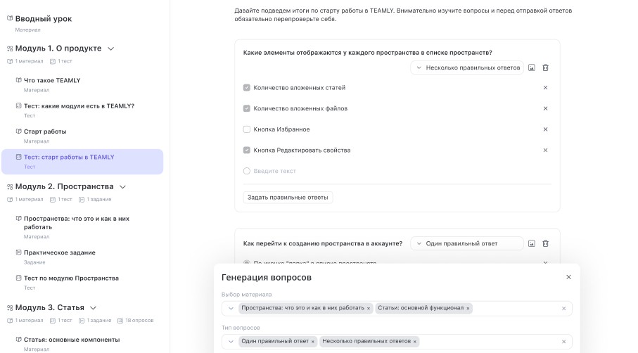 Обновили модуль обучения: теперь TEAMLY AI автоматически формирует тесты на основе материалов курса. Для оценки усвоения материала умный помощник формирует вопросы, выбирает оптимальные форматы (вопросы с несколькими вариантами ответов, открытые вопросы) и настраивает сложность тестов. Это позволяет поставить интеллектуальную проверку знаний на поток с высокой степенью адаптивности под конкретные задачи компании.