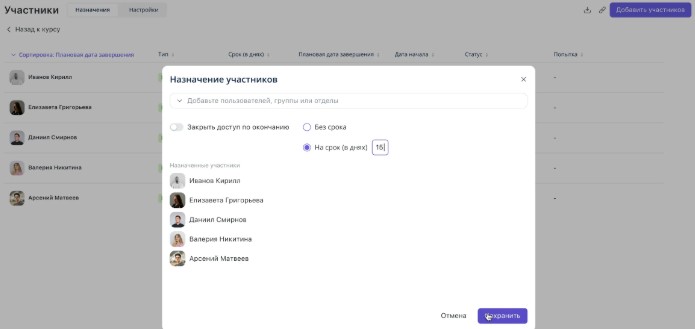Контролировать сроки обучения стало проще: вы задаете дедлайны для курсов, а система автоматически закрывает доступ после их окончания. Благодаря этому обучение становится управляемым и прозрачным, а HR избавляется от необходимости вручную следить за соблюдением графика.