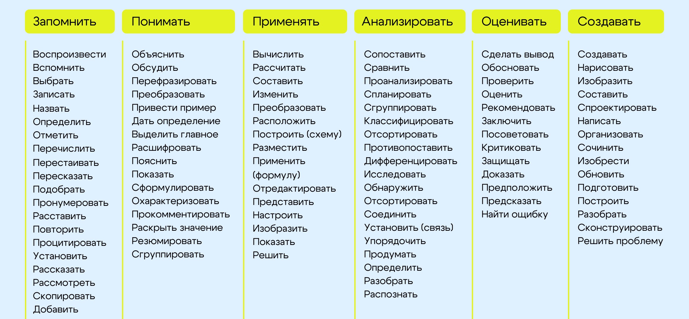 По сути, это «лестница навыков»: от запоминания → к пониманию → к применению → к анализу → к оценке → к созданию.