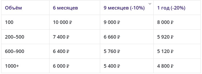 В таблице выше видим, что при объёме 200–500 читателей на срок 1 год стоимость пакета составляет 5 920 ₽.